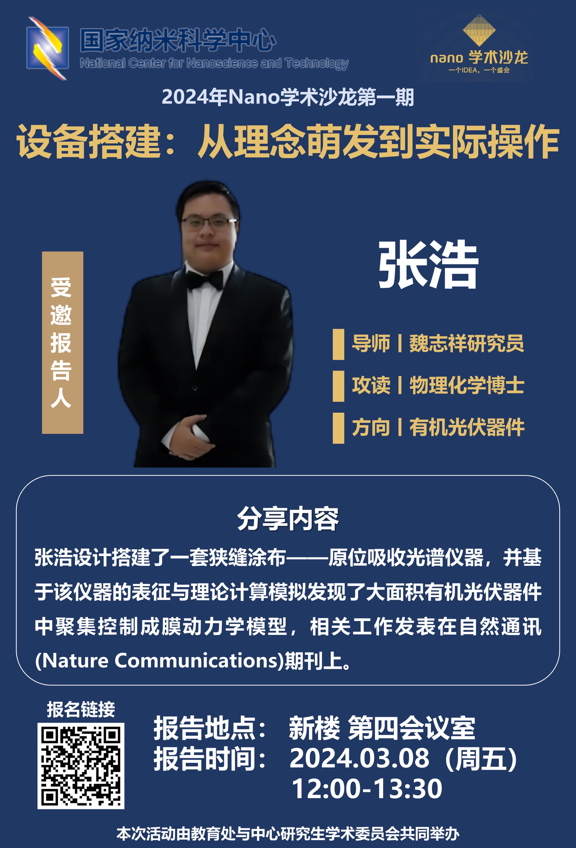 去年,正值国家纳米科学中心成立二十周年这一具有里程碑意义的时刻,中心研究生学术委员会和教育处成功举办了五期精彩纷呈的Nano学术沙龙系列活动,为广大学子带来了丰富的学术体验与深刻的思考。新学期伊始,Nano学术沙龙活动再度回归,继续秉承其一贯的高品质和深度内涵,为广大师生提供学术交流与思维碰撞的优质平台。此沙龙旨在聚焦纳米人的成长与发展,邀请纳米研究领域的耕耘者分享他们的成长经历、学术生涯的点点滴滴、创业的心路历程,以及最新的研究进展和科研仪器/软件的使用技巧。近距离共同探讨纳米科学与工程的学术价值和工程应用问题,为推动纳米科学的发展贡献智慧和力量。