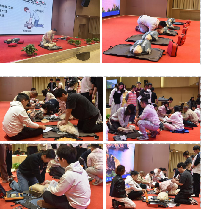 在心脏骤停急救部分,培训围绕无效呼吸识别、“黄金四分钟”原则以及院外心脏骤停抢救的生存链展开,帮助研究生们构建完整施救流程。随后,现场开展心肺复苏(CPR)与自动体外除颤仪(AED)实操演练,依次进行意识判断、胸外按压及AED设备操作。