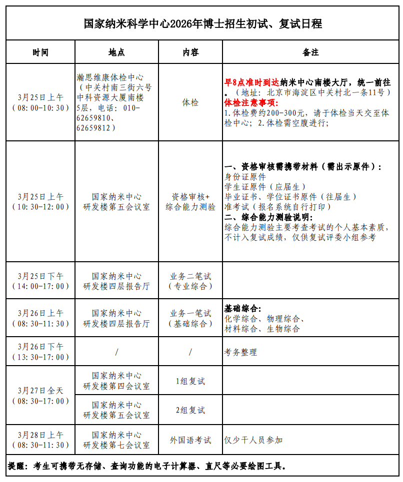 国家纳米科学中心2026年申请-考核制博士初试、复试日程安排